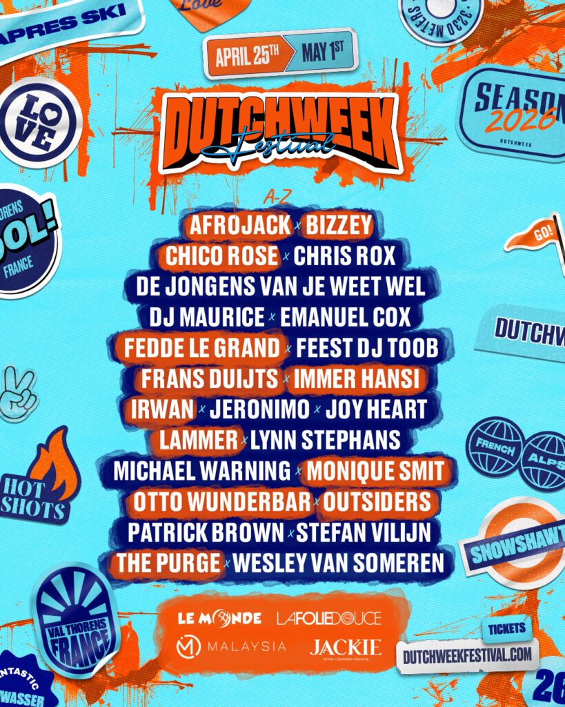 Dit is waar je op hebt gewacht. De volledige line-up van Dutchweek Festival 2026 is hier. Van A tot Z. Van losgaan bij La Folie Douce tot vlammen in Malaysia....